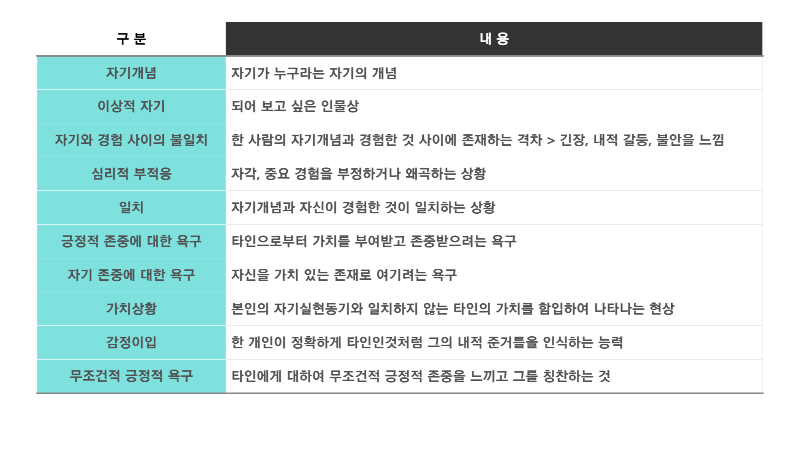 또한 Rogers는 치료가 잘 수행되려면 두 가지 조건이 필요한데, 클라이언트가 자기와 경험 사이에 존재하는 불일치로 인해 불편해하거나 불안을 느낄 필요가 있다는 것과 클라이언트가 치료자에 의해 충분한 수용 및 이해되고 있으며, 클라이언트를 진심으로 배려하고 있다는 비위협적 분위기 조성이 필요하다.