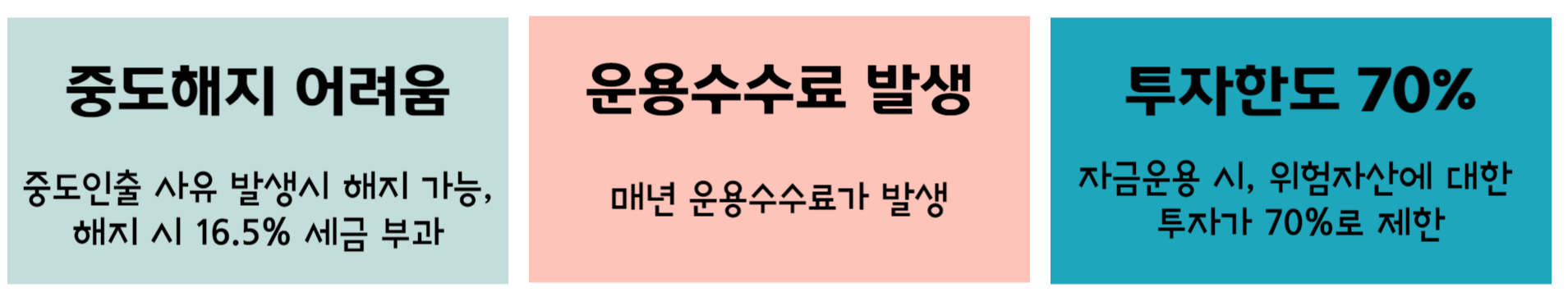 IRP 계좌가 다 장점만 있는 것은 아닙니다. 위와 같이 중도해지의 어려움, 운용수수료 발생, 투자한도 70% 등 단점이 있습니다.