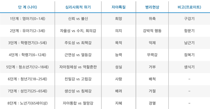 앞장의 '에릭슨의 정신역동이론 ①'에서 에릭슨의 발달 단계의 전반적인 내용에 대해 다루었다면, 해당 장에서는 이에 이어 에릭슨의 심리사회적 발달단계와 관련하여 아래 표와 같이 간단하게 내용을 정리하고, 각 단계별로 좀 더 자세하게 다루어 보고자 한다.